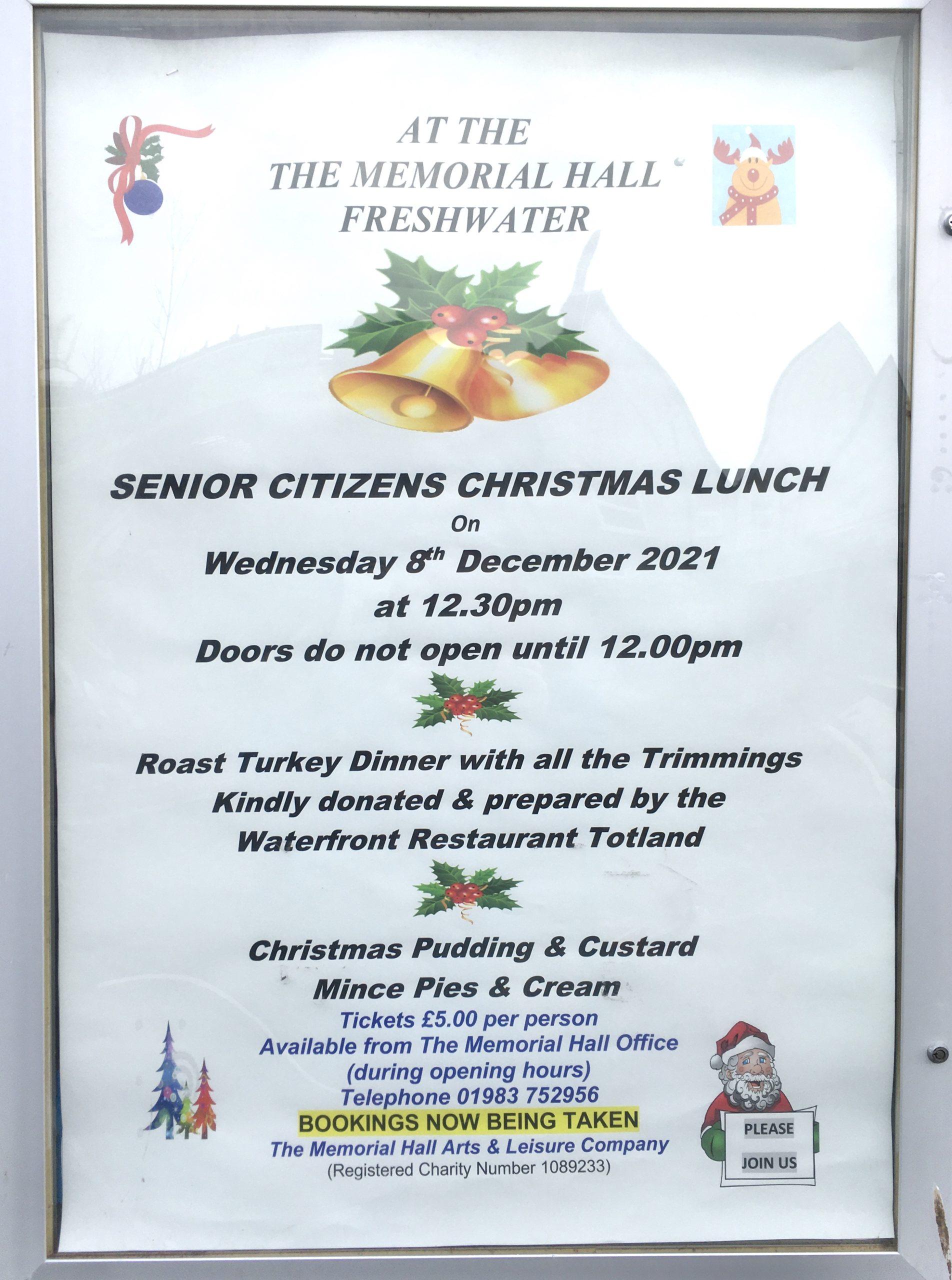 « All Events This event has passed. Senior Citizens Christmas Lunch December 8, 2021 @ 12:00 pm - 3:30 pm « Sounds of the 60’s Charity Concert, supporting West Wight Dementia Choir » Add to calendar Google Calendar iCalendar Outlook 365 Outlook Live Details Date: December 8, 2021 Time: 12:00 pm - 3:30 pm
